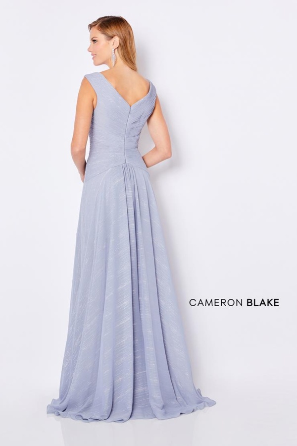 A-line gown with a bateau neckline, cap sleeves, and a dropped waist in a novelty metallic chiffon fabric. Shawl included.