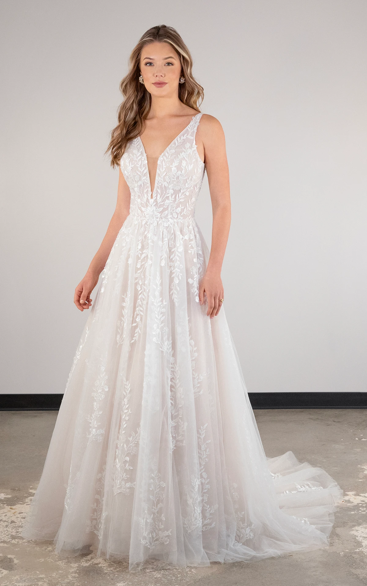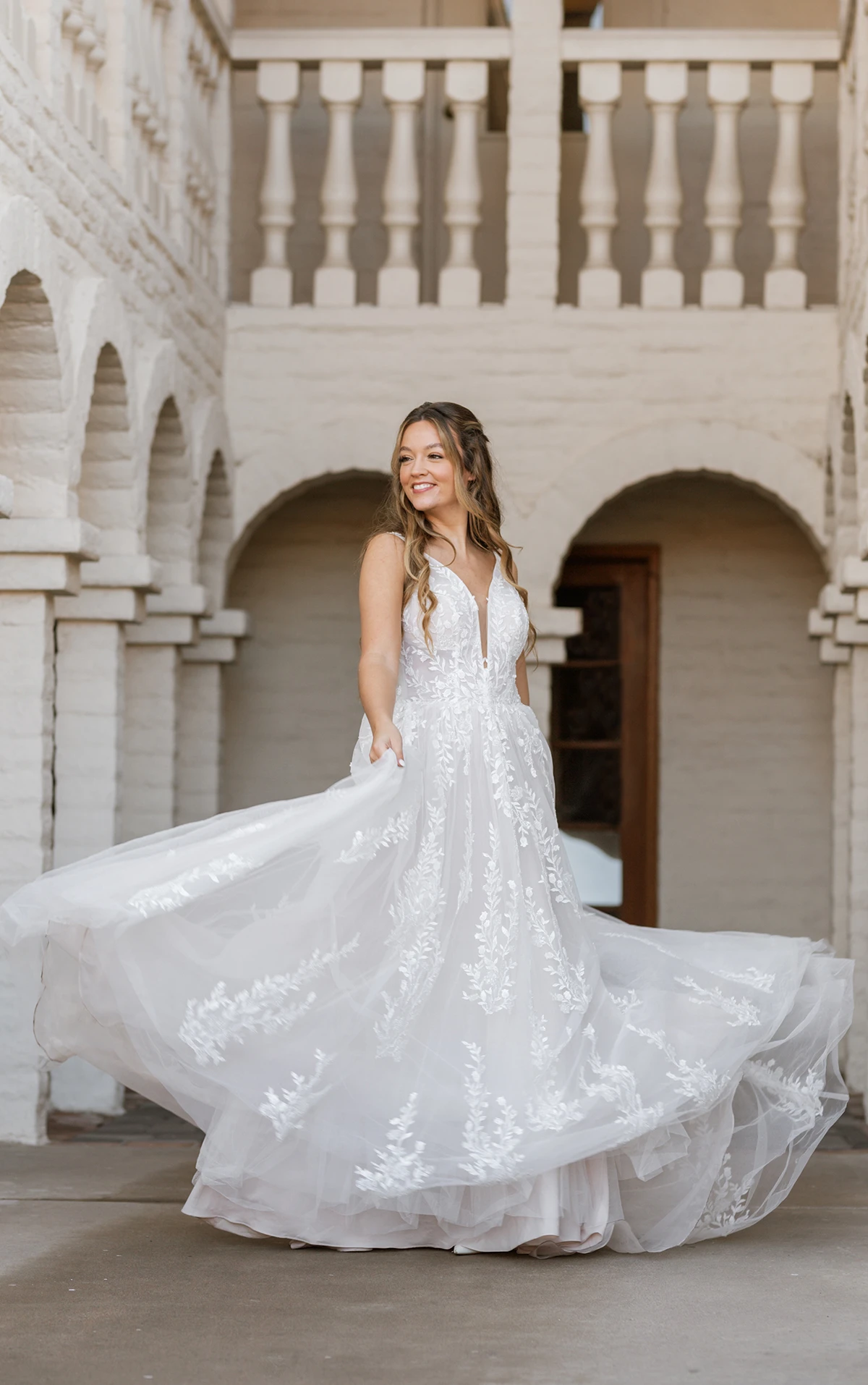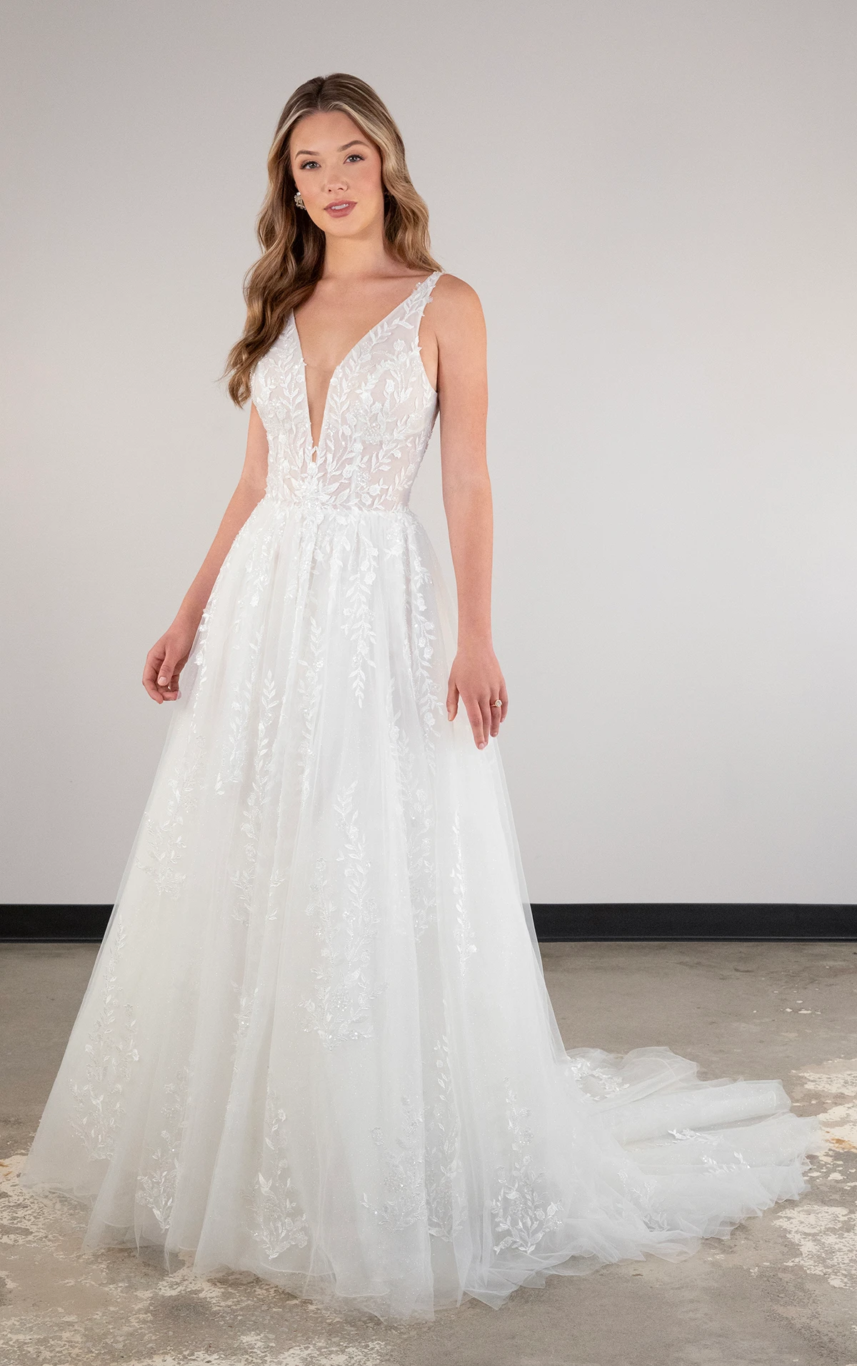Sparkling down the aisle, Jacey’s dreamy leafy floral lace and organza over optional glitter tulle captures the ethereal essence of this romantic A-line wedding gown. Lace-embellished shoulder straps frame a plunging V-neckline topping the sheer, glittering bodice. Leafy tendrils and sparkling floral accents scatter from the bodice to the frothy tulle A-line skirt, evoking a wistful, dreamlike effect. With each step, the glittering tulle catches the light, shimmering for the modern romantic’s walk down the aisle. This gown is also available in plus sizes.