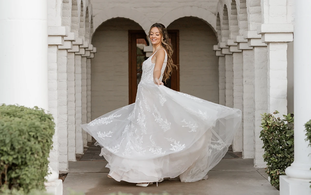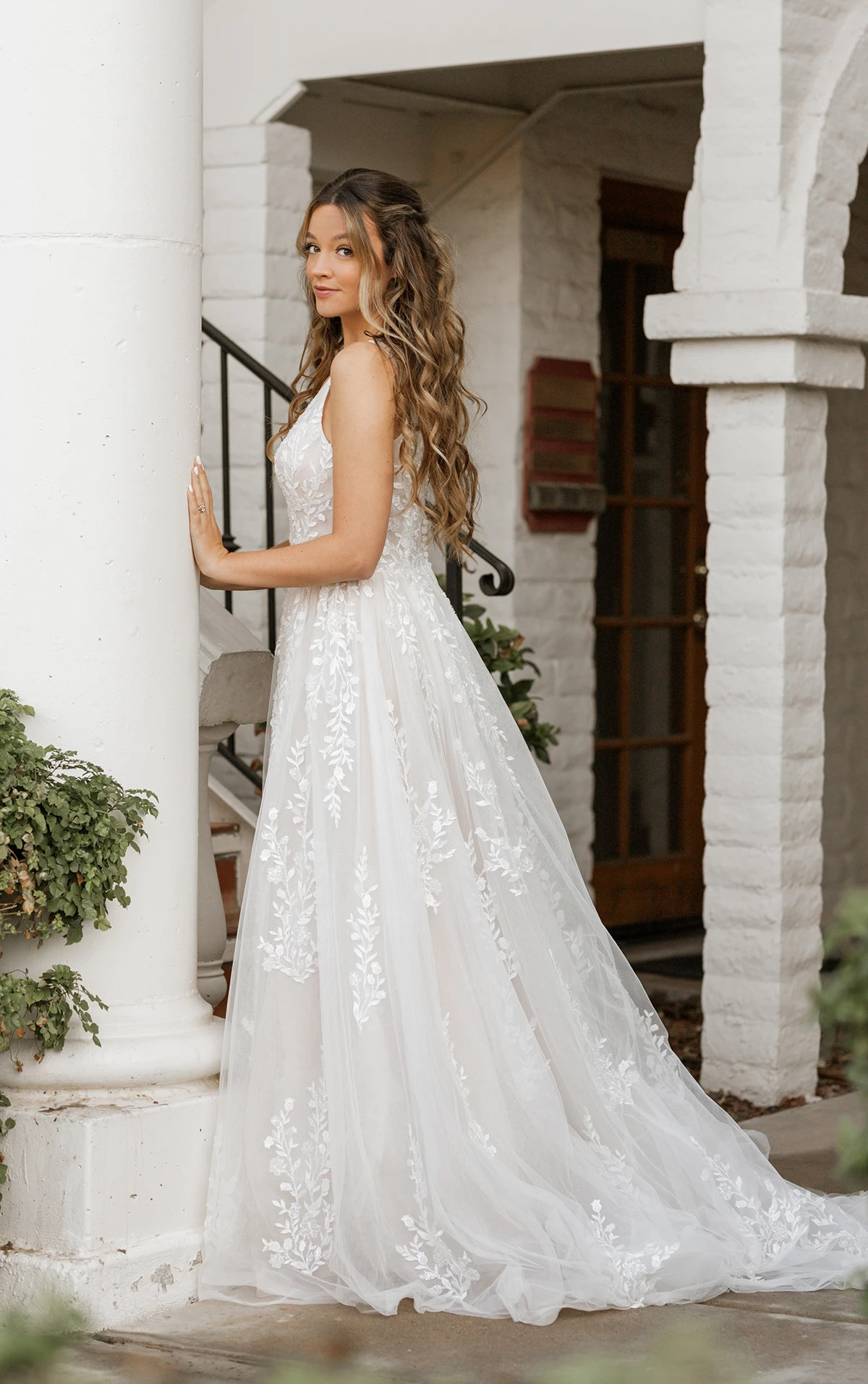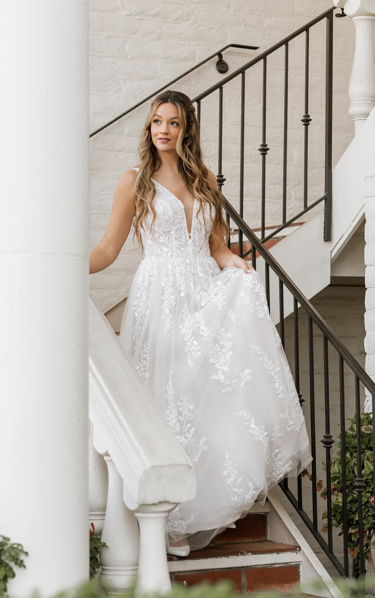 Sparkling down the aisle, Jacey’s dreamy leafy floral lace and organza over optional glitter tulle captures the ethereal essence of this romantic A-line wedding gown. Lace-embellished shoulder straps frame a plunging V-neckline topping the sheer, glittering bodice. Leafy tendrils and sparkling floral accents scatter from the bodice to the frothy tulle A-line skirt, evoking a wistful, dreamlike effect. With each step, the glittering tulle catches the light, shimmering for the modern romantic’s walk down the aisle. This gown is also available in plus sizes.