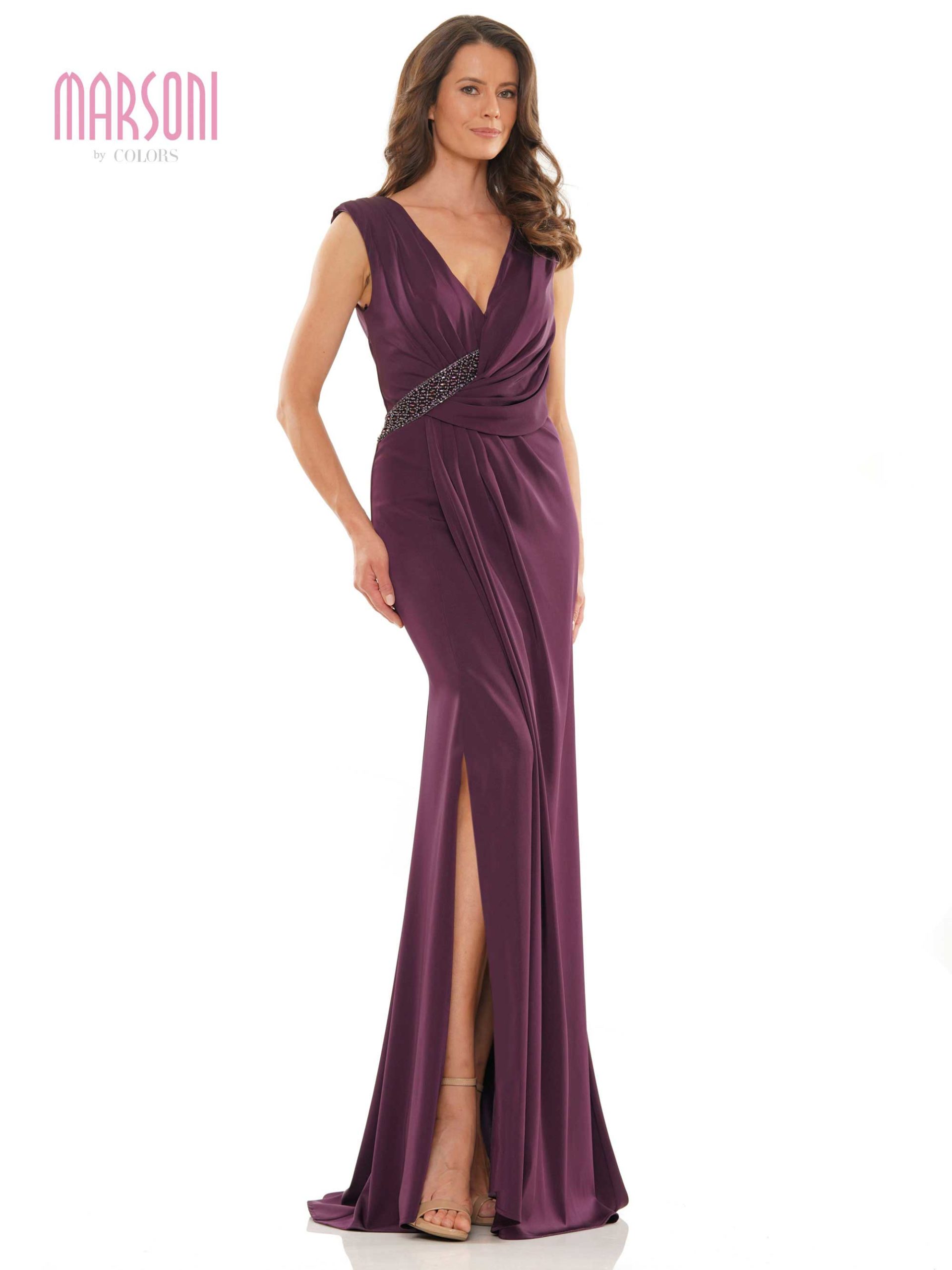 Fit and flare dress with V neck, ruching on the bodice and beading on the waist. The fabric in this Marsoni by Colors style is Stretch Faille with beaded applique.