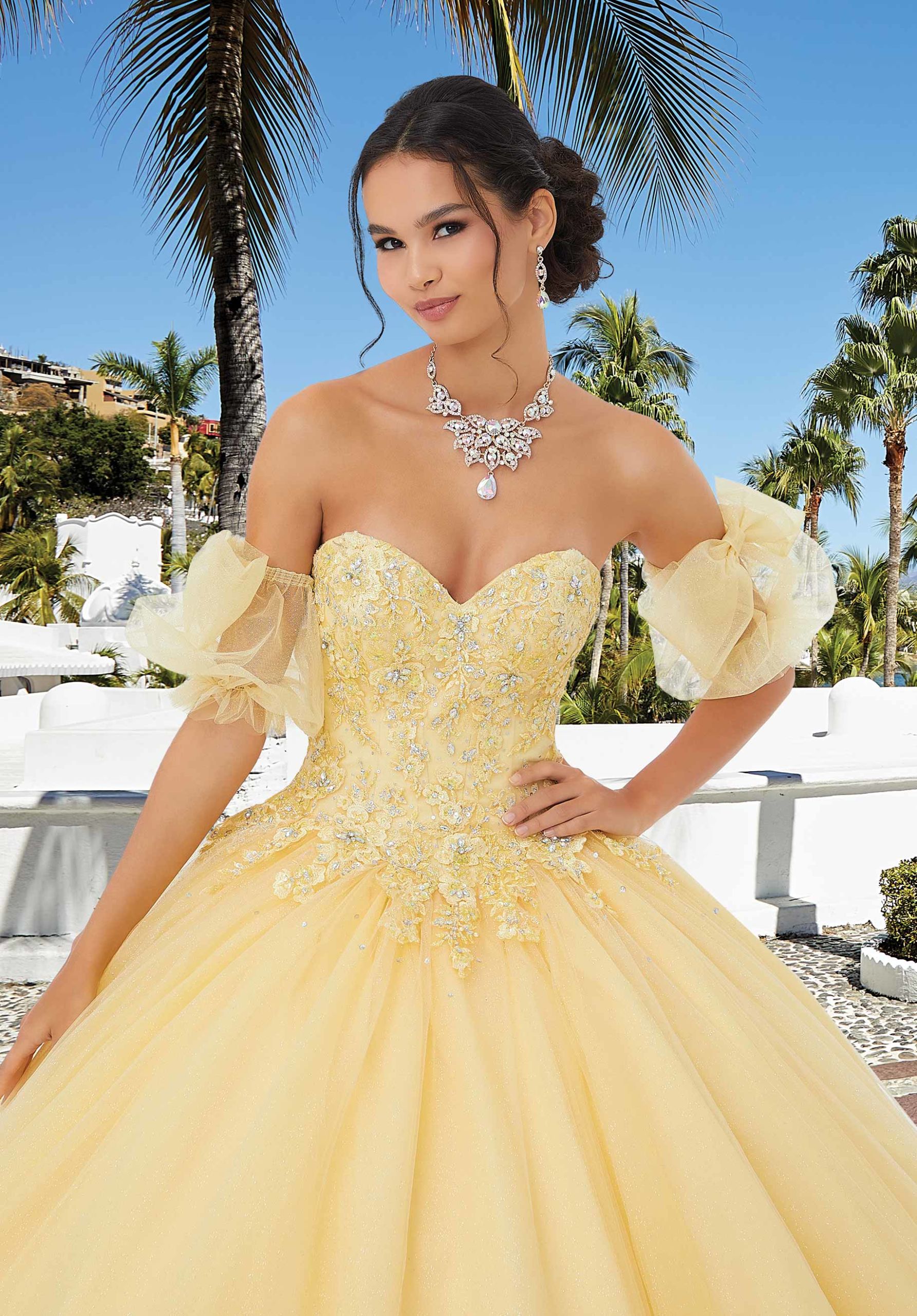 Princess quinceañera ball gown has dazzling crystal beaded, sparkle lace appliqués on the sweetheart, basque waist bodice, and beautiful layered sparkle tulle skirt. Detachable tie bow sleeves add a fairytale touch. Matching stole included.