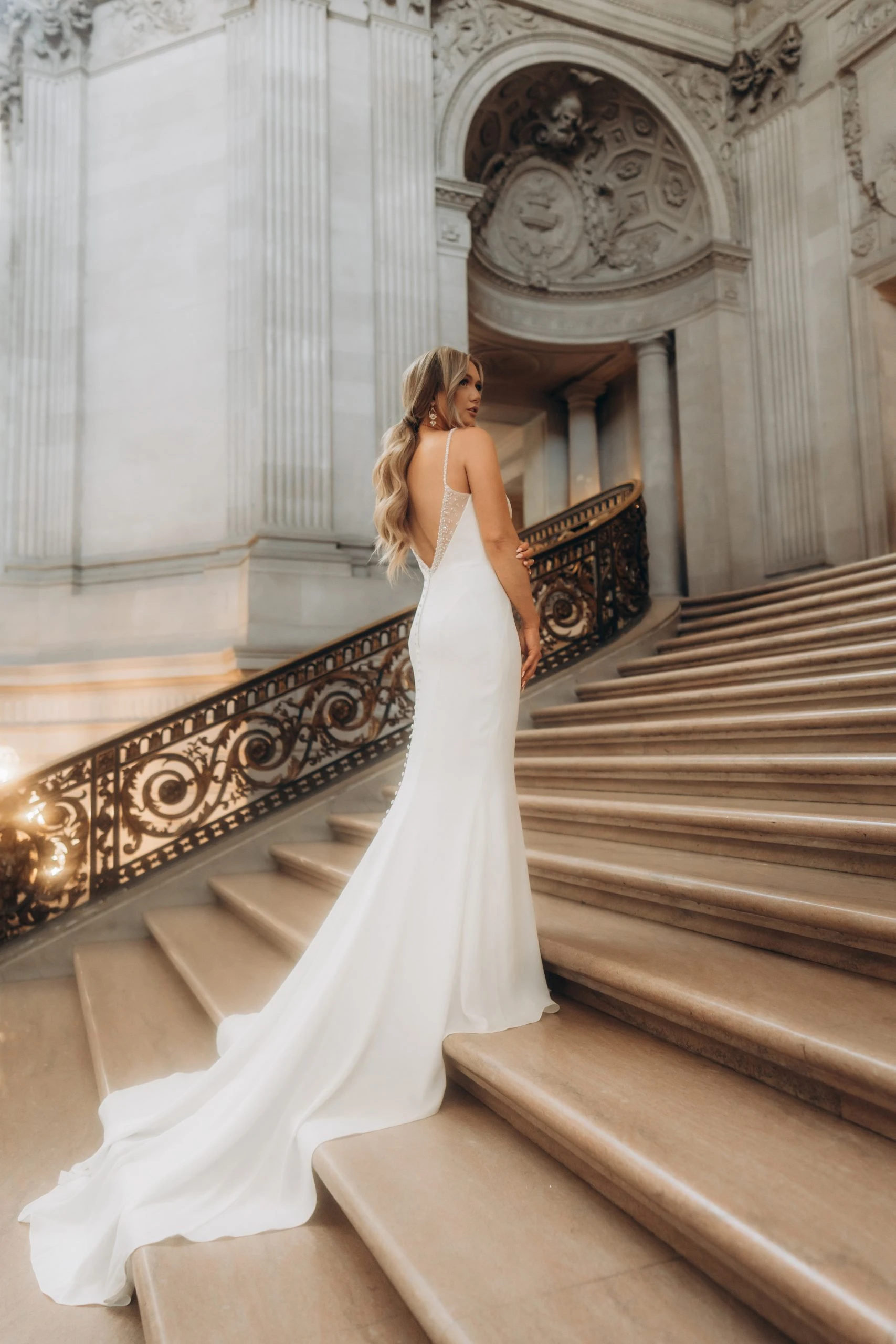 Elegant and sleek, this sexy column wedding dress brings effortless runway fashion to the bridal aisle. Danica features thin, beaded spaghetti straps that meet a flattering draped sweetheart, embellished neckline. Luxe shell crepe fabric gently glides over the figure, melting into an opulent column silhouette with a stunning low back detail to capture every eye on that walk down the aisle. This designer wedding gown was made for the contemporary bride with an affinity for high fashion.