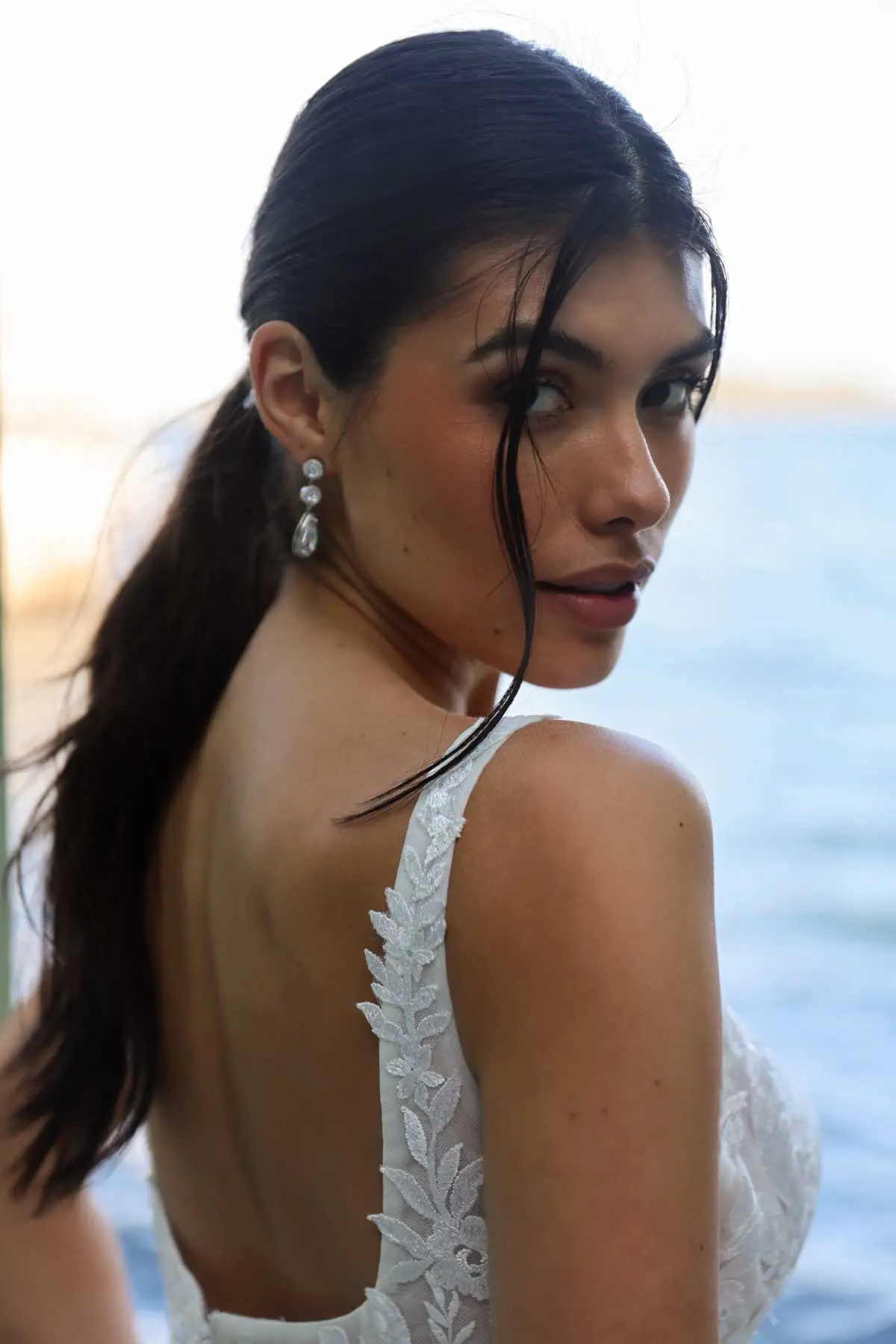 Handcrafted lace details embellish Madeline, from its sheer lace bodice to its luxuriously romantic cutout train. From graceful floral shoulder straps, a stunning square neckline perfectly complements the low square back detail of the translucent lace bodice. Wrapping around the hips, the fine floral details accent the natural figure with hand-placed precision before melting into a clean column sheath skirt. For the final fashion-forward touch, a gorgeous lace cutout train completes this romantic bridal gown for an unforgettable walk down the aisle. This floral lace wedding dress is also available in plus sizes.